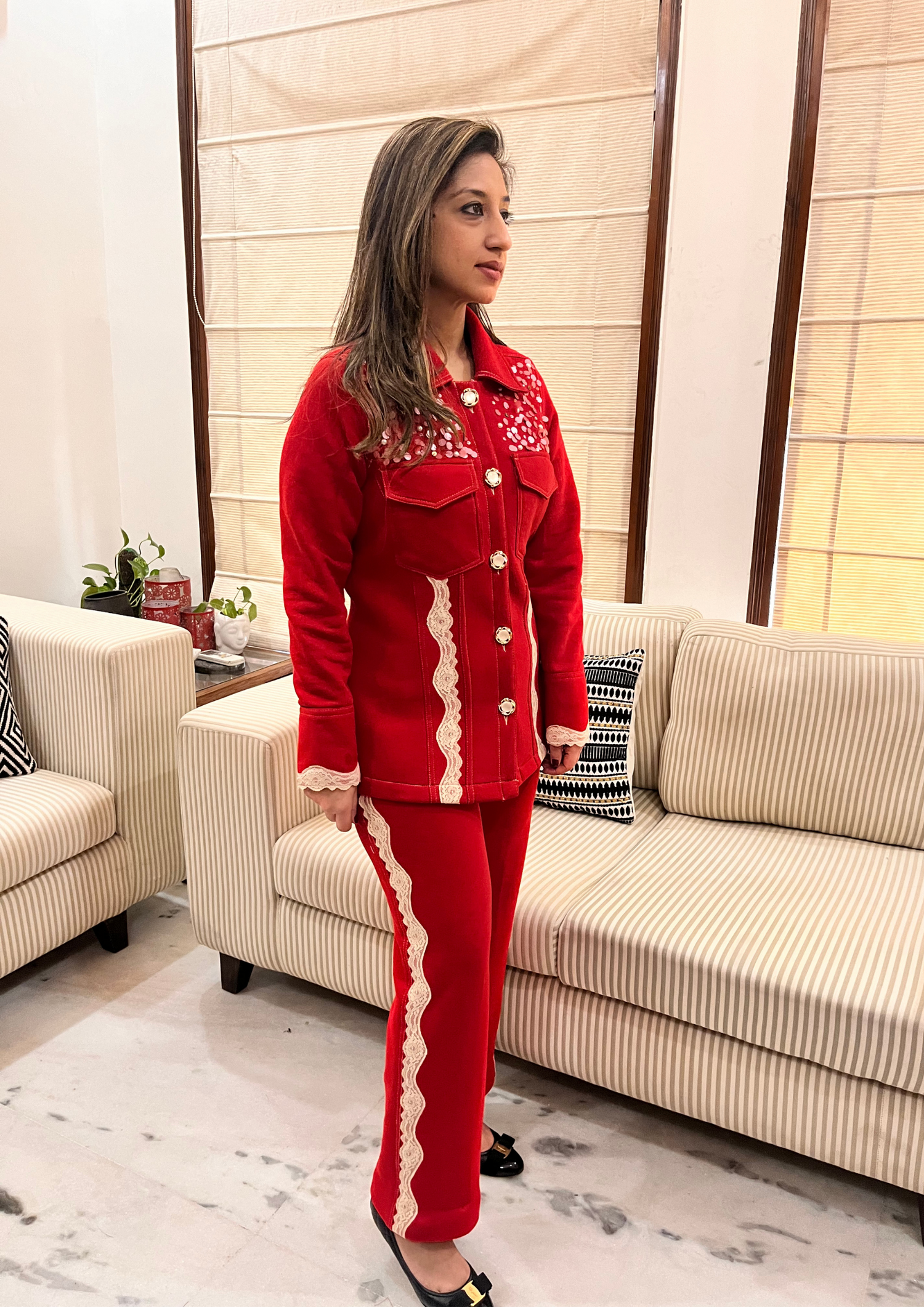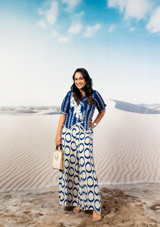 BLUE PRINTED TOP WITH FLORAL PATCH