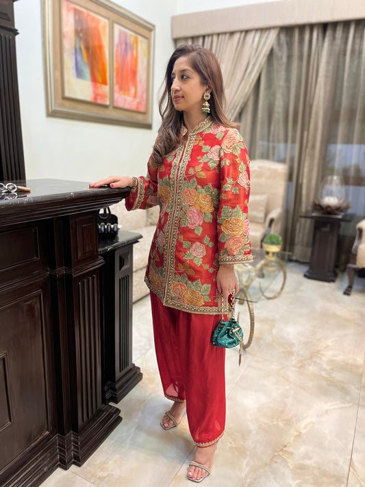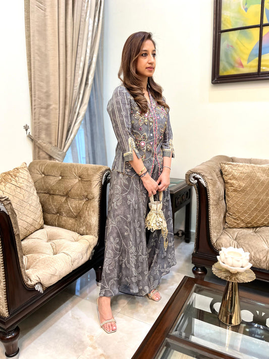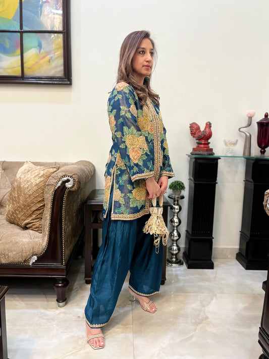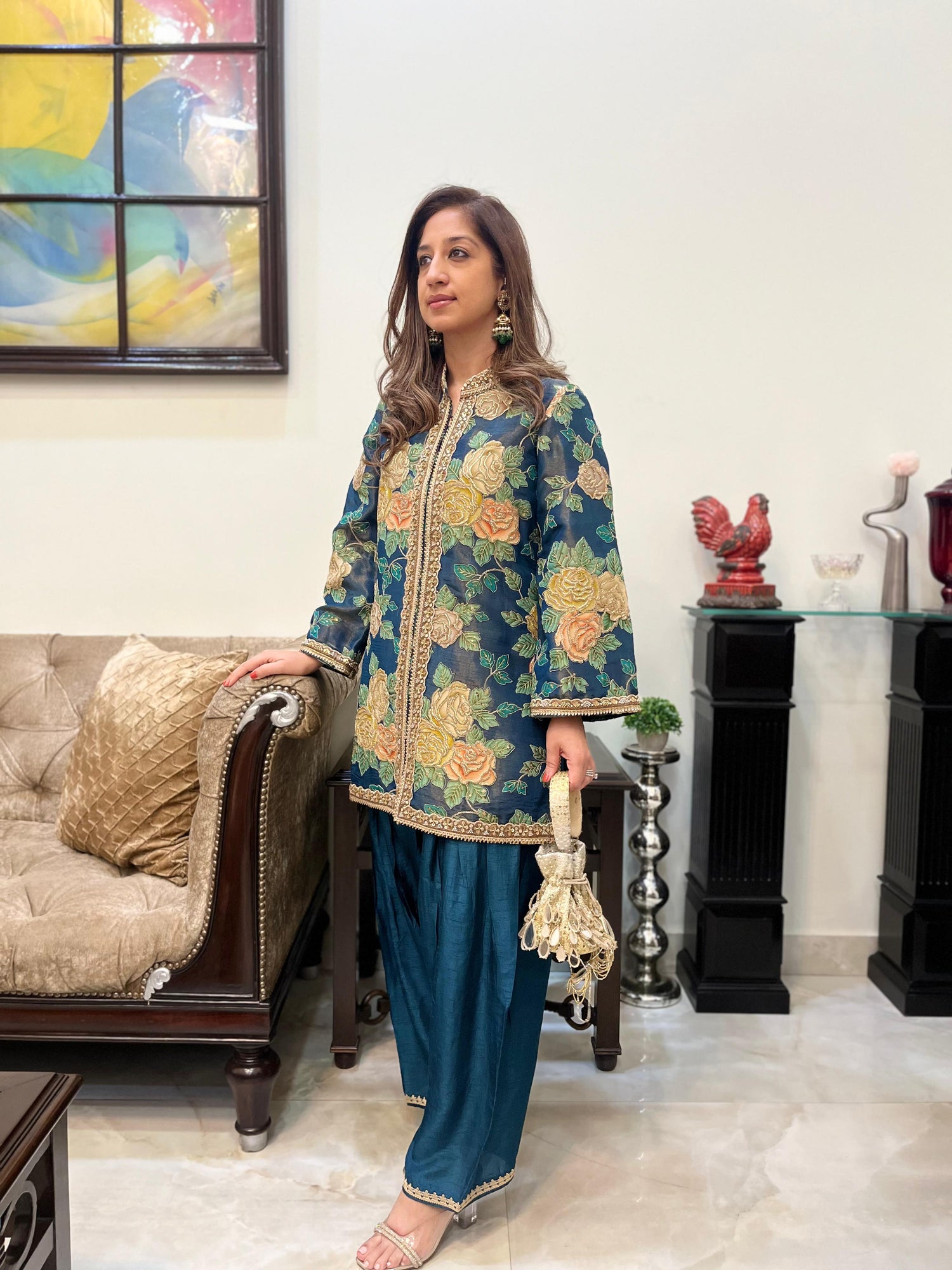 Floral teal blue tissue jacket style kurta with ankle length salwar